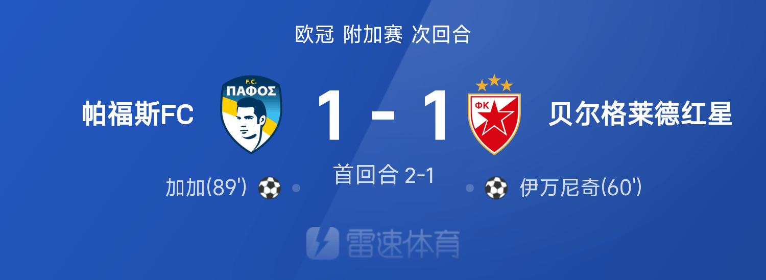 赔率领先-欧冠战报:加加绝平,帕福斯1-1红星,总比分3-2队史首进欧冠正赛